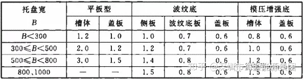 有孔托盘底部通风孔面积,不宜大于底部总面积的30%-40%。梯架直通横档中心间距和梯架弯通横档1/2长度处的中心间距应均为200~300mm,横档宽度应为20~50mm。支吊架和立柱、固定托臂的开孔位置或焊接位置,应满足托盘、架梯多层设置时层间中心距为200、250、300、350mm的要求。各种附件和支吊架在满足相应载荷的条件下,其规格尺寸应配合桥架系列确定。钢制托盘、梯架允许最小板材厚度mm 表1.3-4