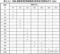 托盘、梯架的直通单件标准长度可分为2、3、4、6m;工程常用的弯通弯曲半径应为70、100、150、200、300、600、900mm。不应使用纯直通型弯通。托盘常用的弯通宽度与其弯曲半径配合mm 表1.3-3