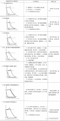 表1列出了几种典型示功图,图中虚线表示压缩机工作正常情况,实线为有故障情况,通过两者比较,判别压缩机的某些故障。表中对示功图的特点作了说明。