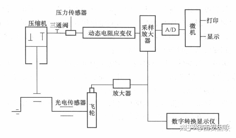 示功图通常利用示功器来测取,常用的示功器有机械式、电气式和电子式,在故障诊断中,一般采用电子式示功器。图1是电子式示功器微机系统示意图。图中应变式压力传感器送出的压力信号由动态电阻应变仪调制成1V范围内的电压信号,经过采样放大器放大和零电平移动,由A/D变换器转换成数字量后输入微机。同时,光电传感器送出气缸内活塞止点信号,此信号经放大,一路送往数字转速显示仪测定转速;另一路经采样放大器调制后,作为开关量直接输入微机外设接口,控制A/D变换器的启动及采样循环的终了。系统可完成数据采集、处理、打印及数据文件存储。