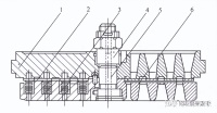 图2是环状阀结构简图,它由阀座、阀片、弹簧、升程限位器及气阀螺栓组成。阀座和升程限位器之间的连接可采用螺栓或螺钉。螺钉连接的优点是进、排气阀的阀座及升程限位器可以互换;缺点是螺钉头有可能断裂而落入气缸,造成重大事故。所以必须增加挡圈,近年来气阀大多用螺栓连接。低压时,螺孔制成通孔,为防止工作时松动,螺栓端部应予铆死;高压时,为了防止通过螺纹漏气,螺孔制成盲孔,螺栓的防松依靠螺栓上凸缘与阀座(或升程限位器)进行挤压力锁紧。螺栓直径根据气阀直径依照有关标准选取,一般均在 10mm 以上。