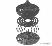 环状阀由阀座、阀片、弹簧、升程限制器、连接螺栓和螺母等组成。分解图见图17。环状阀制造简单,工作可靠,可改变环数来适应各种气量要求。环状阀缺点是:阀片各环彼此分开,在开闭运行中很难达到步调一致,因而降低了气体的流通能力,增加额外的能量损失。阀片等运动元件质量较大,阀片与导向块之间有摩擦力,环状阀经常采用柱形(或锥形)弹簧等因素,决定了阀片在开闭运动中不容易做到及时、迅速。由于阀片的缓冲作用较差,磨损严重。