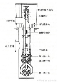 凝结水泵主要由吸入喇叭口,第一级叶轮,泵的第二、三级,支撑管及排水弯头,机械密封,轴承和电动机等部分组成。下图为三级立式沉箱型凝结水泵的结构。