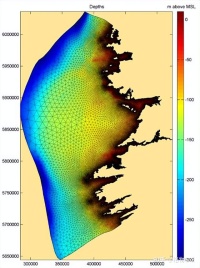 预测系统的准确性取决于包括测深模型的准确性、模型精度和模型边界条件(预测风、表面压力和水位)在内的诸多因素。通过前期的调研工作,广泛地获取了测深资料,并将其汇集收编。数据主要源于爱尔兰地质调查局和海洋研究所的联合INFOMAR项目,该项目拥有一套多来源的广域范围内爱尔兰海岸周围水深测量数据,囊括了多波束测量数据和激光雷达数据。通过使用OPW提供的详细激光雷达数据,以及INFOMAR数据范围外的海上数据(GEBCO 2014),最终生成了海湾区域内大尺度地形模型。