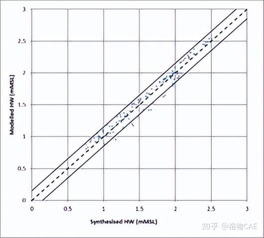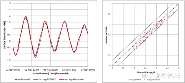 工程师们分别基于Harmonie和ECMWF驱动条件计算模型数据,并采取了12h内和24h内的预测结果与实测结果进行对比。模型预测结果与统计散点图如图 7 所示,其中散点图的误差线是0.25m目标精度。可以发现,模型预测结果与观察结果相当吻合,并且使用两种不同的条件计算出的不同结果间没有明显的差异。而统计散点图也表明绝大部分数据处于目标精度范围内,仅少数几个高水位略有低估。