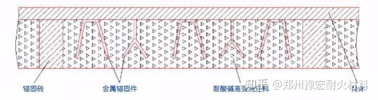 采用上述浇注料在回转窑筒体的内表面上浇注厚度不低于250mm。内衬包括多块呈轴向均匀分布固定于筒体内表面的酸性或中性锚固砖,锚固砖两侧的筒体内表面固定有多个均匀分布的金属锚固件,再用耐酸碱高温浇注料,该耐酸碱高强浇注料通过锚固砖和金属锚固件与筒体连接为一体。局部内衬结构如图1所示。