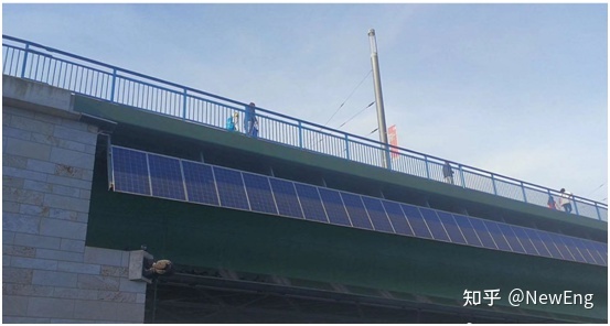 在高速桥梁箱梁南向一侧设置支架,安装光伏组件,为桥梁用电设备供电。