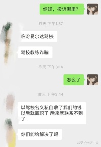 近日,”临汾便民服务网“的网友爆料称:自己最近遇到了困惑!在临汾易尔达驾校报名了考驾照,结果教练以驾校的名义私自收取了费用后直接离职了!!现在驾校不承认,教练跑路了,这名学员该何去何从.....