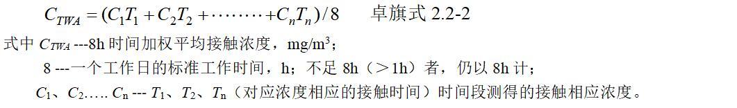 个体检测是测定TWA比较理想的方法,能较好的反映劳动者个体实际接触水平和工作场所卫生状况,是评价化学有害因素职业接触的主要检测方法;定点检测也是测定TWA的一种方法,主要反映工作场所空气中化学有害因素的浓度,也反映劳动者个体接触水平。应用定点检测方法测定TWA时,应采集一个工作日内某一工作地点、各时段的样品,按各时段的持续接触时间与其测得的相应浓度乘积之和除以8,得到一个工作日的接触化学有害因素的时间加权平均接触浓度(CTWA)。CTWA可根据式2.2-2计算,并据GBZ 2.1表1和表2判断该物质是否超标。