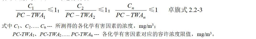 (1)当工作场所存在两种或两种以上化学有害因素时,若缺乏联合作用的毒理学资料,应分别测定各化学有害因素的浓度,按式2.2-3计算每个因素的接触限值比值,并按各个因素对应的OELs进行评价。
