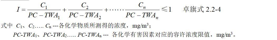 (2)当两种或两种以上有毒物质共同作用于同一器官、系统或具有相似的毒性作用(如刺激作用等),或已知这些物质可产生相加作用时,则应按下式计算混合接触比值(I):