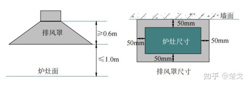 厨房排风罩有两种基本类型:伞形罩和侧吸罩。排风罩的设计应符合下列要求:如图2.6-7所示,排风罩的平面尺寸应比炉灶边尺寸大100mm(注:长边及短边各大出100mm),排风罩的下沿距炉灶面的距离不宜大于1.0m,排风罩的高度不宜小于600mm。