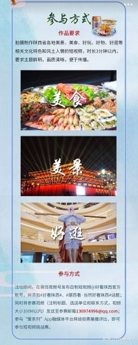 千年古都西安、红色革命圣地延安、百里山水画廊汉中、青铜之乡宝鸡、三圣故里渭南,陕西的每个地方都有自己的独特魅力,选取你认为最能代表地方特色的视角,把最好看最精彩的一面呈现在世界面前。