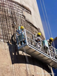 梅州烟囱碳纤维加固_砖烟囱加固维修_烟囱水泥砂浆粉刷2.8 工作台的周围应设置围栏和保护网,内外吊梯的外侧和底部以及工作台的底部均应设置保护网。梅州烟囱碳纤维加固_砖烟囱加固维修_烟囱水泥砂浆粉刷2.9 上料罐笼应设有断绳安全卡和行程限位开关,使用过程中应经常检查。在烟囱底部罐笼停放处应有缓冲装置。梅州烟囱碳纤维加固_砖烟囱加固维修_烟囱水泥砂浆粉刷2.10 烟囱上升到 20m 左右时,上高空的操作人员,应挂安全绳,拴速差式安全带(附有速差式自控器)。梅州烟囱碳纤维加固_砖烟囱加固维修_烟囱水泥砂浆粉刷2.11 提升罐笼的卷扬机应设有防止冒顶和蹲罐的限位开关以及行程高度指示器、电磁抱闸应工作可靠。梅州烟囱碳纤维加固_砖烟囱加固维修_烟囱水泥砂浆粉刷2.12 垂直运输系统上下滑轮必须设置防止钢丝绳脱槽的限位器装置,并要有专人检查和维护。梅州烟囱碳纤维加固_砖烟囱加固维修_烟囱水泥砂浆粉刷2.13 在高空中拆除工作台时,必须制订拆除方案,在统一指挥下进行作业。