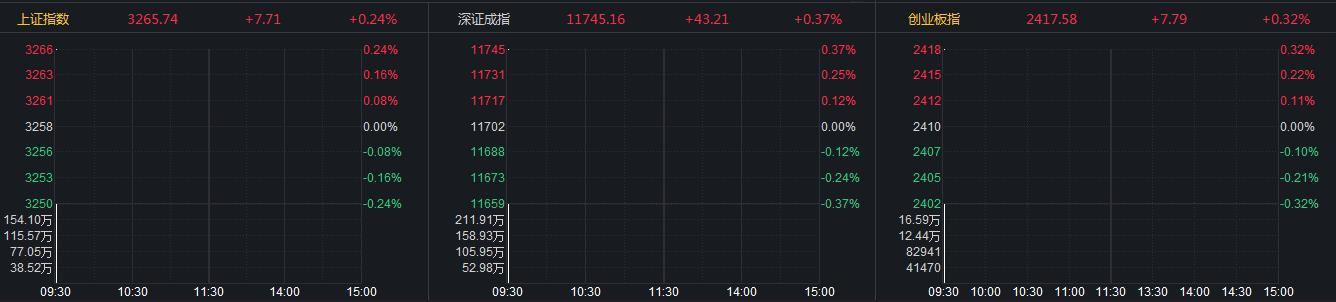 n上证指数涨0.24%,报3265.74点;深证成指涨0.37%,报11745.16点;创业板指涨0.32%,报2417.58点。