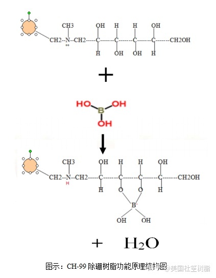 其原理是CH-99离子交换树脂这种化学结构在官能团中具有多羟基部分与硼之间生成络合阴离子,其胺基部分作为阴离子交换基捕捉生成的络合阴离子,从而选择吸附硼离子。CH-99树脂不受大量共存盐类的影响,其反应对pH值很敏感,络合离子只有在中性或碱性溶液里才能生成,在酸性溶液里络合离子分解。