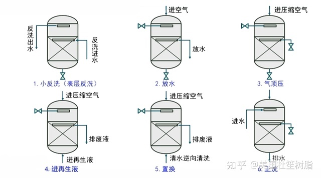 与顺流式相比,逆流式离子交换器的再生方式要略微复杂一些,以逆流式交换器顶压法再生过程为例: