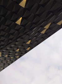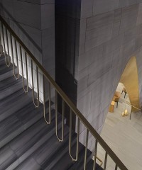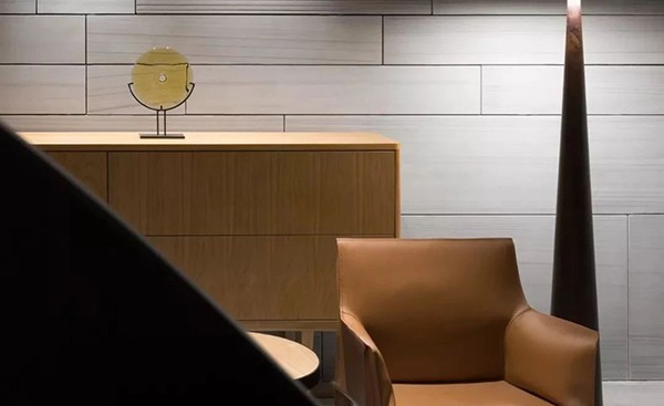 同一矿山的石头经由不同工艺加工后,形成拉丝纹理、30%哑光和60%哑光三种表面质感,由于相异界面对光线反射属性的差异,带来同一立面上深浅不一的明暗关系,主动丰富空间表达而不破坏整体纯粹性。