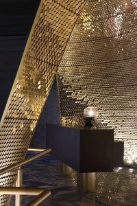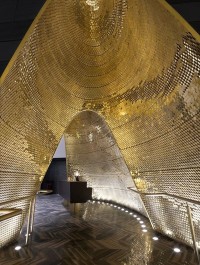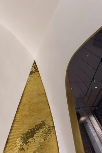 洞穴内壁呈自下而上逐渐收缩的多维曲面造型,在马赛克铺贴的过程中由于曲面面积收缩所导致的马赛克规律性拼接受到挤压,加设计设计师通过预留变形缝的方法,为多维曲面造型增加水平向的段数,分别为每段单独设定铺贴起始点,形成规律与自由并存的动态秩序。