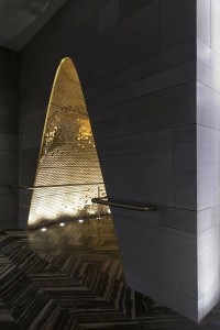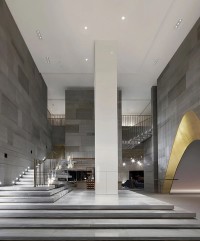 打开自我的感知之门,直到通过狭窄的裂缝看到所有的事物。大堂是天然洞穴的重新构景,加设计在场域中并置一系列不相连的中空石块,通过开凿洞孔,将石块内部未知莫测的空间释放,形态不一的内部形成了相对私密的半隐形环境,穿过石块的内部和石块之间的间隙,形成开放和围合相交替的连续体验。