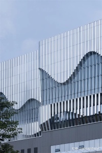 铝板幕墙采用镜面和哑光两种铝板格栅相间布置,形成强反射与弱反射的交替节奏,以条带化的抽象反射将周围环境映衬在建筑表皮之上。参数化的峰丛曲线作为基准线,设定每条格栅的长度,并且通过格栅的单向弯折来实现宏观上的三维曲面效果。这种处理方法有效地降低了工程难度和造价,同时又增加了立面的机械感与构成感,既符合建筑的工业理性,又呼应了建筑的人文属性。