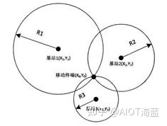 TOA 定位通过分别测量移动终端与三个或更多基站之间信号的传播时间来定位,它采用了圆周定位。假如己知移动终端到基站 i 的直线距离为 Ri,那么由几何原理可知,移动终端的位置一定在以基站 i 的位置为圆心,Ri 为半径的圆周上。同理可得,多个圆的共同交点就是移动终端的位置。