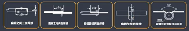 问答题2:给出正确的扁钢焊接搭接示意图,扁钢与扁钢搭接至少几面施焊?其他方式的搭接示意图和焊接要求有哪些?