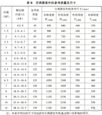 4.2.1条文:空调器室外机平台尺寸不应小于空调器室外机本体尺寸 与空调器室外机周边所需预留的空间尺寸之和。无法确定空调器 室外机本体尺寸及周边所需预留的空间尺寸时,空调器室外机平台尺寸不应小于本规程附录A中的规定值。详见下表:
