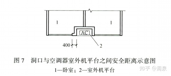 4.3.2-3条文:空调器室外机平台不宜设置在与阳台、窗洞口或检修门水平距离400mm以上的位置;