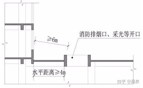 其措施可以参考浙消[2020]166号文件中的2.3.2条文:建筑屋顶和地下室顶板上开设消防排烟口、采光、通风等开口时,该开口与上部建筑开口之间的直线距离不应小于6m(且水平距离不应小于4m)。如下图: