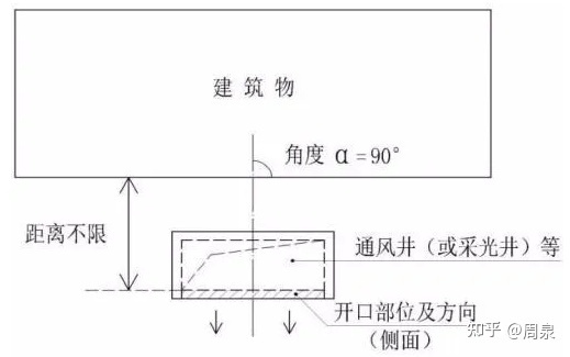 2.3.3条文:当建筑屋顶和地下室顶板上开设消防排烟口、采光、通风等开口采取防火分隔措施时或开口背向建筑物时,开口与上部建筑的距离可不限。如下图: