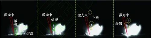 飞溅的产生会降低焊缝质量,可能会引起焊缝表面塌陷等缺陷。张羽昊等[14]通过研究复合焊接稳定性的影响,发现随着激光功率的增大,金属蒸气作用力对抑制熔滴过渡占支配作用,金属蒸气对“匙孔”壁的作用是复合焊接过程中“匙孔”壁上方飞溅产生的主要原因,激光功率越大,“匙孔”壁上方产生飞溅次数越多。匙孔后壁上方飞溅形成过程如图6所示。