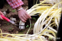 揭开覆盖的地膜,将挑选好的蒜瓣浸种以后进行紧密排蒜,将蒜瓣挨个紧排于蒜池内,空隙用小蒜瓣和细沙覆盖,1平方米池子约需要蒜种15-20公斤左右。此时需要注意,蒜头的密度要大,囤蒜要平。因为密度大才能够充分的使蒜黄在后期获得高产;囤蒜要平是因为这样可以最大程度保证后期采收时的高低基本一致。