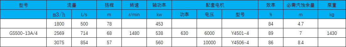 GS500-13A/4型水泵流量、扬程、转速、电机功率、效率、轴功率、必需汽蚀余量、进出口径、泵头重量