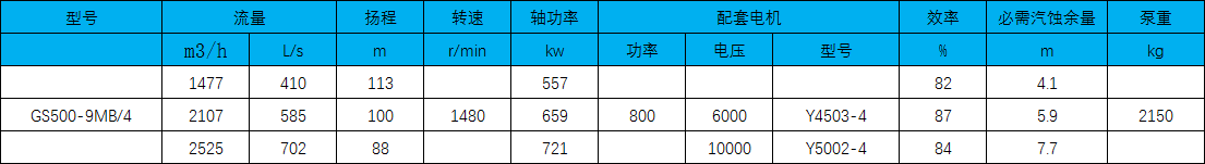 GS500-9MB/4型水泵流量、扬程、转速、电机功率、效率、轴功率、必需汽蚀余量、进出口径、泵头重量