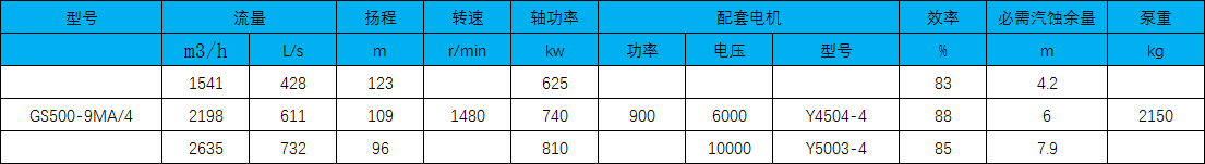 GS500-9MA/4型水泵流量、扬程、转速、电机功率、效率、轴功率、必需汽蚀余量、进出口径、泵头重量