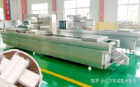 一般常用的有2款,一款是滚动式真空包装机,另一款则是拉伸膜包装机,它们是如何包装的呢?滚动式真空包装机顾名思义,是通过输送带传送来进行工作的,人工将年糕装入到袋子中,摆放在袋子中,抽真空、封口成品输送均由设备完成,它如何进行多规格的转变呢?滚动真空包装机的输送带和真空室上盖组成一个真空室,通过输送带上的托板来调节袋子的大小。