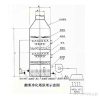 酸雾净化塔在呈酸性或碱性的酸雾废气,内置有新型的阶梯环填料(或球型多面空心填料),气-液接触比表面积大;当废气经过分配板,将气体平均分布于多面空心球,每只呈点接触,摆列后呈“W”路线行走,避免有偏流现象,在配合龙卷式不阻塞的喷嘴,呈1200喷洒,使气液混合效率90-95%,通过逆流式吸收液(中和液H2SO4或NaOH自动添加处理设备)的雾化喷淋洗涤,从而达到洁净效果,再加入中和液,可祛除废气中有害气体。一般设有二级喷淋装置,并可根据气体浓度不同,组成更多层的喷淋装置,而达到率的净化效果。