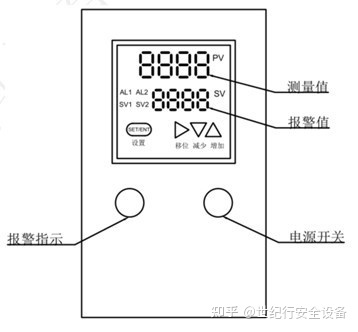 如图,PV显示测量值,SV显示报警值,当测量值大于报警值时压差报警器报警。压差报警器有两路报警输出AL1和AL2。AL1报警时AL1指示灯亮,报警指示灯闪烁并发出蜂鸣声,AL2报警时AL2指示灯亮,继电器动作,继电器接口为8P端子排上右边(6、7、8)三个接线柱。