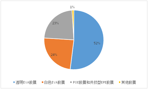 目前,市场上封装材料主要有透明EVA胶膜、白色EVA胶膜、聚烯烃(POE)胶膜、共挤型聚烯烃复合膜EPE胶膜等。2021年,单玻组件封装材料仍以透明EVA胶膜为主,约占52%的市场份额,较2020年下降4.7个百分点;白色EVA胶膜约占24%的市场份额;POE胶膜和共挤型EPE胶膜合计市场占比提升至23%,随着未来双玻组件市场占比的提升,其市场占比将进一步增大。