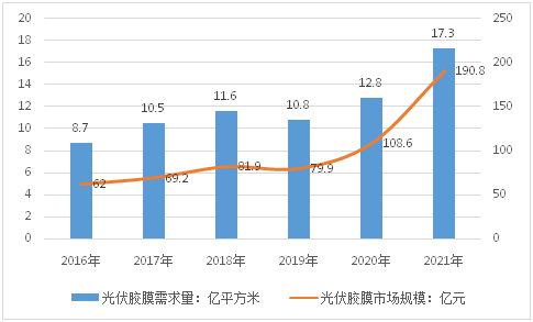 近年来,光伏组件封装胶膜市场呈增长态势。2021年,全球封装胶膜市场需求约21亿平方米,同比增长28.0%,其中,我国光伏胶膜需求量达到17.3亿平方米。