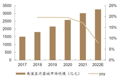 高端医疗诊疗装备领域前景广阔。据中商情报网分析,目前,我国高端医疗器械行业仍存在进口占比过高的问题,需要加快补齐高端医疗器械短板,加快关键核心技术攻关,实现高端医疗器械自主可控。预计在政策利好下,我国医疗器械产业将逐渐迈向高端,高端医疗器械行业前景广阔。数据显示,2020年中国高值医疗器械市场规模为2575.00亿元,同比增长19.5%。预计2022年中国高值医疗器械市场规模将达3257.25亿元。我国手术机器人市场规模从2017年的1.31亿美元增长至2021年的7.55亿美元。预计2022年将继续呈增长趋势,手术机器人市场规模将进一步达到11.37亿美元。