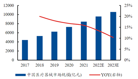 医疗器械行业市场规模在政策支持、需求迸发以及进口替代等多因素推动下从2017的4403亿元扩容至2021年的8438亿元(CAGR为17.66%),预计2023年达到10564亿元,其中2021年医用耗材市场份额达28.96%。