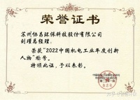 2023年1月,由中国机械工业联合会会刊——中国机电工业杂志组织评选的“2022中国机电工业年度创新人物”揭晓,协昌环保总经理刘瑾女士荣获“中国机电工业年度创新人物”。