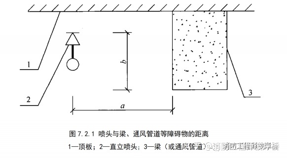 在梁或其他障碍物的下方布置喷头时,喷头与顶板之间距离不应大于300