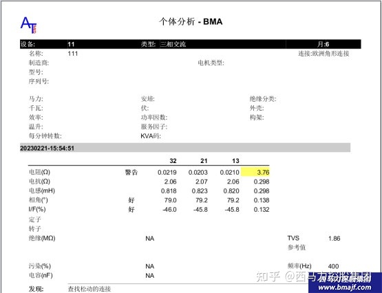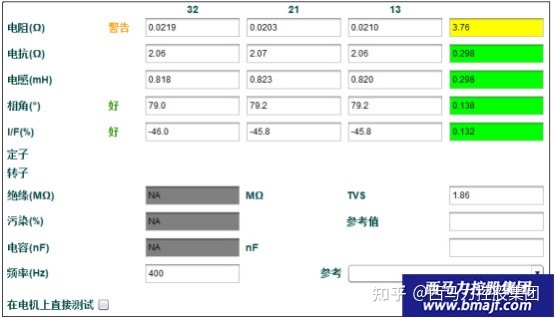 电机直流电阻R测试偏差较大,其它各项测试数据正常,建议检查电机接线盒连线和配电柜一次侧的所有连线。