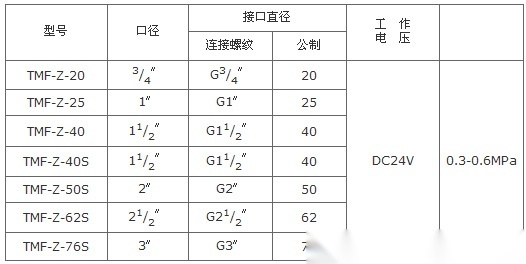 nTMF—Z直角式电磁脉冲阀型号规格表(mm)