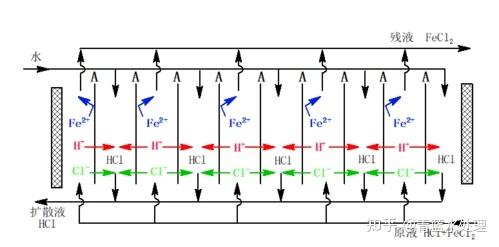 扩散渗析具有设备简单、投资少、基本不耗电等优点,可用于:①从冶金工业的金属处理废液中回收硫酸或盐酸;②从浓硫酸法木材糖化液中回收硫酸;③从粘胶纤维工业的碎木浆料处理液中回收氢氧化钠;④从离子交换树脂装置的再生废液中回收酸、碱等。在工业上应用较多的是钢铁酸洗废液的回收处理。钢铁酸洗废液一般含10%左右的硫酸和12%~22%的硫酸亚铁。