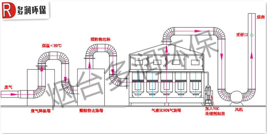 低温VOC处理法是近几年新兴的一种非甲烷总烃废气处理方法。它采用脉冲喷射技术(高气液比、低 带水量) 使 VOC 处理剂与废气充分结合,完成皂化分解反应。