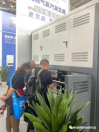 值得一提的是新能科旗下三大创新产品:变频直流式电加热蒸汽发生器、0.5吨热水模块炉(单台设计尺寸可做到6吨)、99kw壁挂式冷凝燃气热水炉精彩亮相,吸引众多经销商、意向商和参展观众流连驻足、咨询探讨。据了解,展会第一天,新品1吨变频直流式电加热蒸汽发生器已被合作伙伴订购。